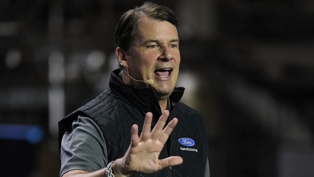 Jim Farley, president and chief executive officer of Ford, speaks at the Ford Motor Co.’s Kentucky Truck Plant to launch the 2025 Ford Expedition, in Louisville, Kentucky, April 30, 2025.
